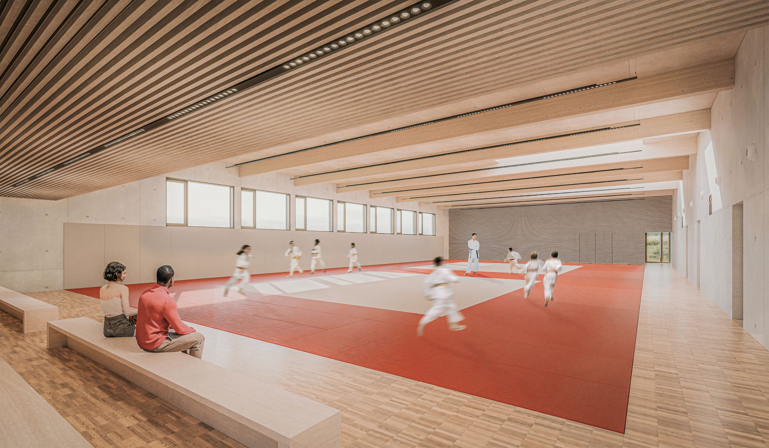 La silhouette découpée du bâtiment fait ressortir les deux volumes dissociés de la Salle de réception et du Dojo. L’entrée est abritée par un volume doré en porte à faux. La palette de matériaux est réduite : béton architectonique, aluminium, verre, bois (charpente, parquet, doublages acoustiques) et linoléum. Les enduits de façades métallisés brillants et mats soulignent cette volumétrie et offrent une vision changeante du bâtiment selon la lumière.